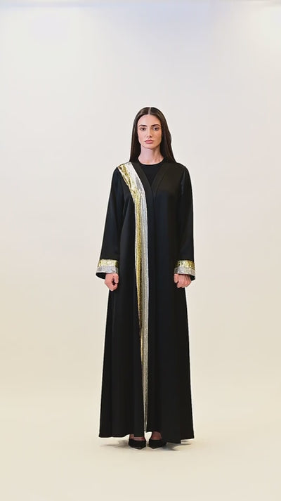 A modern abaya with bold metallic accents in gold and silver. Crafted in a sleek black fabric, it strikes the perfect balance between tradition and high-impact glamour. Ideal for evening elegance or standout moments.